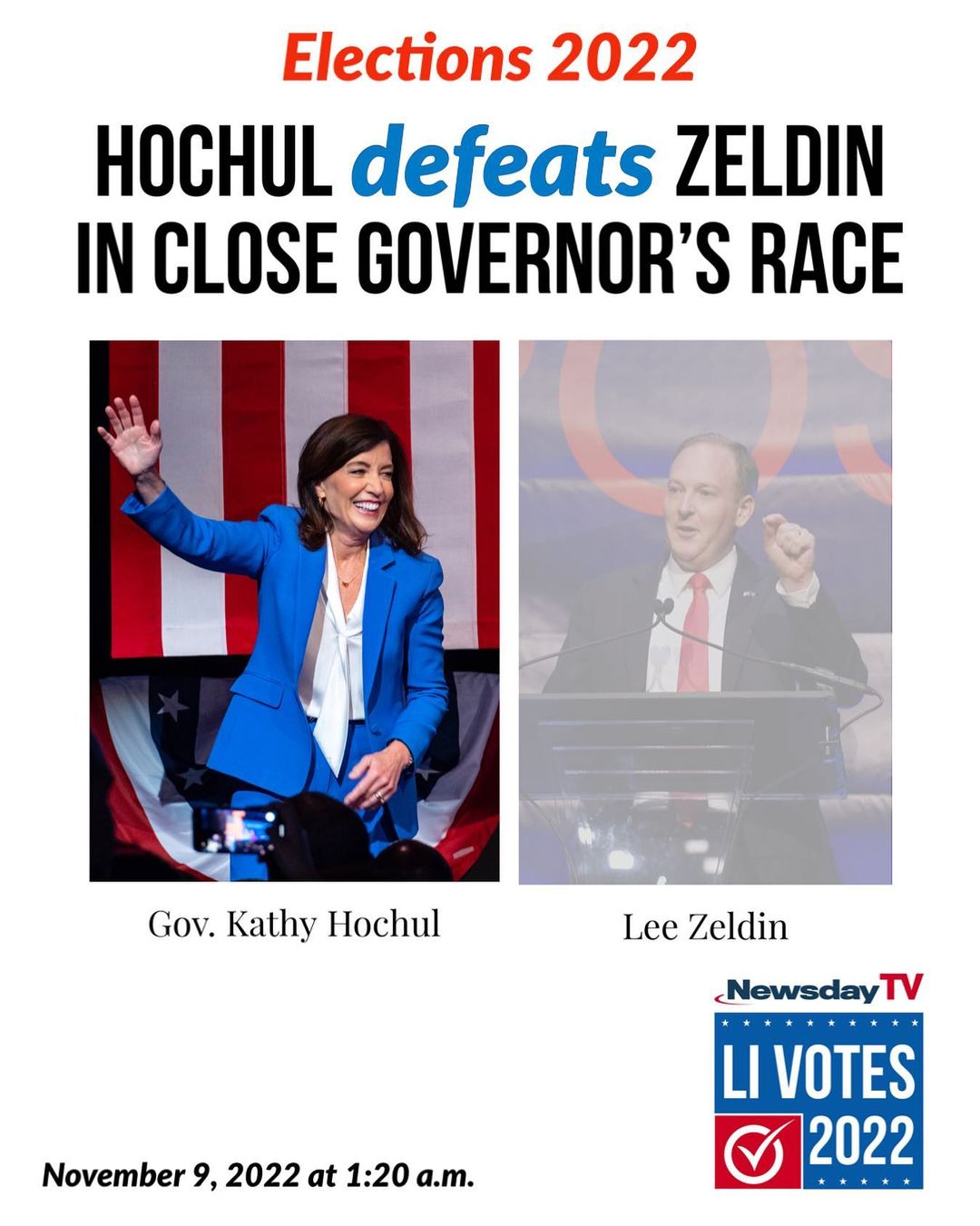 Democratic Gov. Kathy Hochul defeated Republican Lee Zeldin in a close race Tuesday, making history as the first woman elected governor in New York.