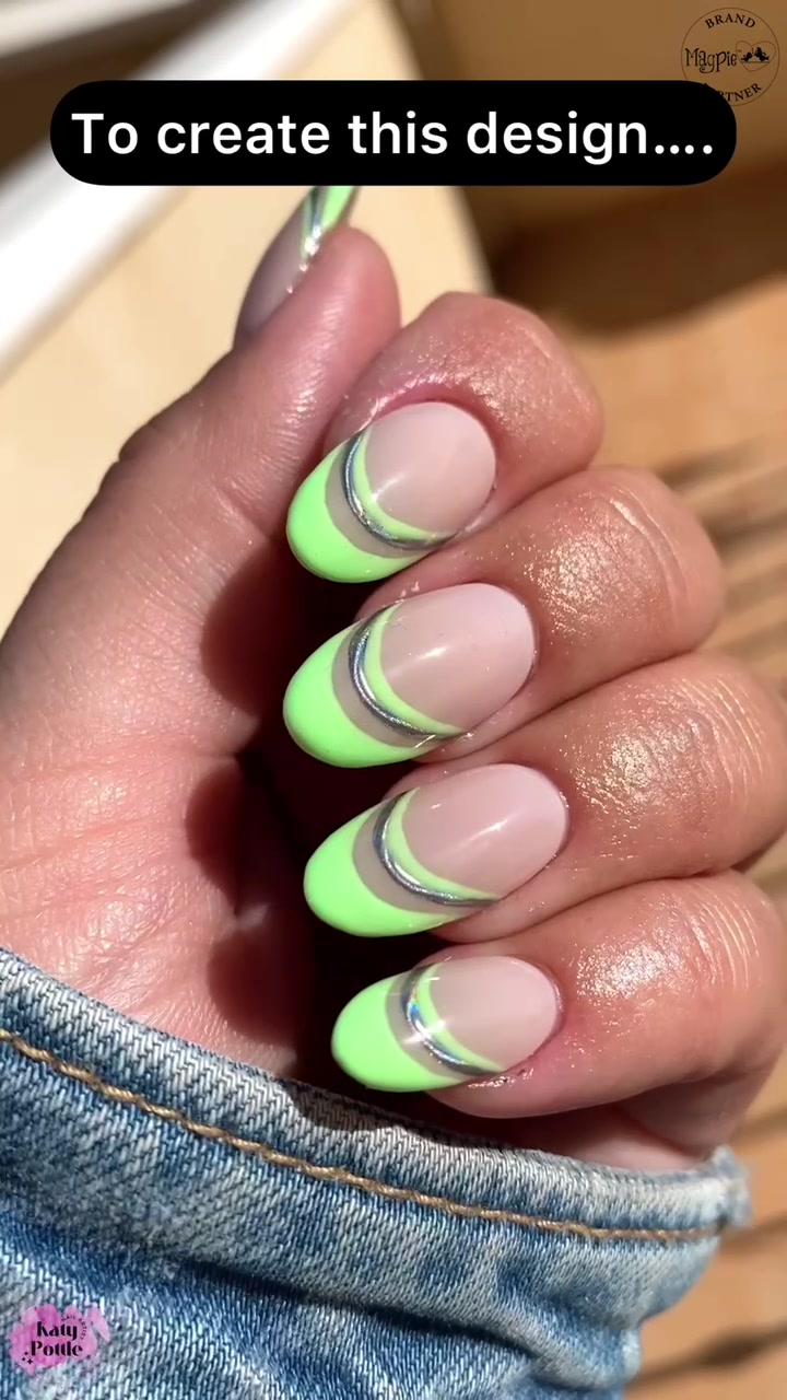 I’m hanging on to the brights...... keep watching to see how I create this triple french design. Using @magpie_beauty products 💚Good Golly miss Molly 💚Aloe Vera 💚give me strength 💚Aurora 💚Top it off _________________________________ #nailvideotutorial #nailtiktoks #triplefrench #chromenails