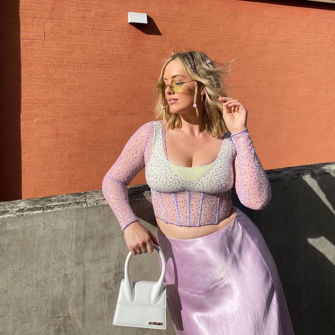 Angel @jessraeking making her case for lilac + green as the ultimate colour combo π«Άππ two things to remember hunnies: 1. We just restocked the Certified Freak Bodice in black π and 2. we recommend sizing up in this style especially if youβve been blessed with a bigger bust ππ§ββοΈ