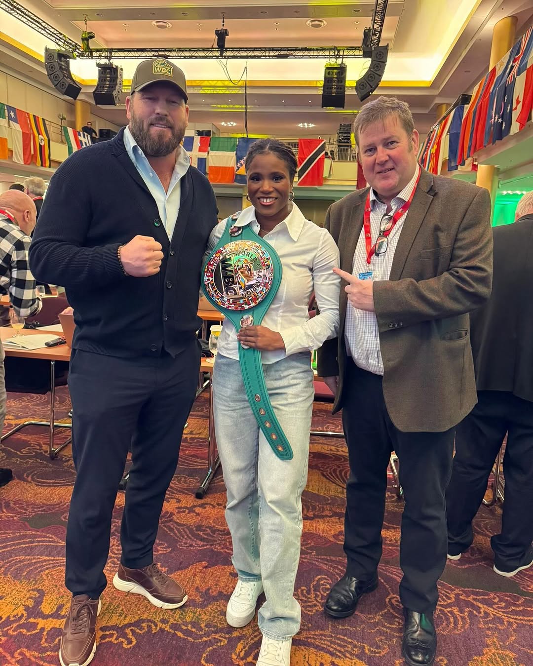 WBC Cares UK chairman Scott Welch and WBC Cleto Reyes UK Director Dave Walker congratulating Caroline Dubois as she is crowned Lightweight WBC World Champion at the World Boxing Council convention in Hamburg - huge congratulations from us in the UK @__carolinedubois1 💚💛 👏🏼
