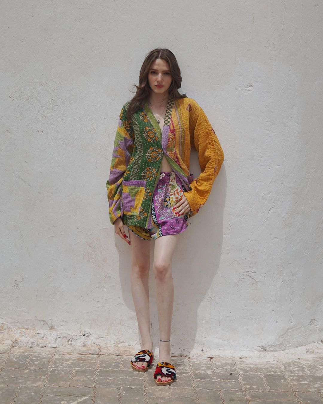 Our kantha kimono & shorts, and Moroccan rug sandals.