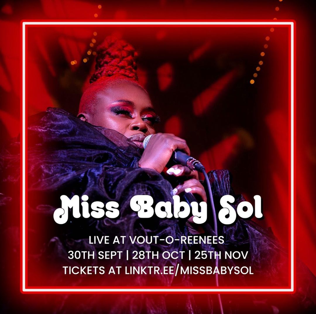 This Autumn, join the @MissBabySol Residency at Vout-O-Reenee's 🤗 A beautifully intimate venue for her live show. Baby will be on stage doin' her thing – original music, written and performed live – expect eclectic mixes of music that'll make you laugh, cry, sing and dance with joy. We can't wait to have you come join the fun!