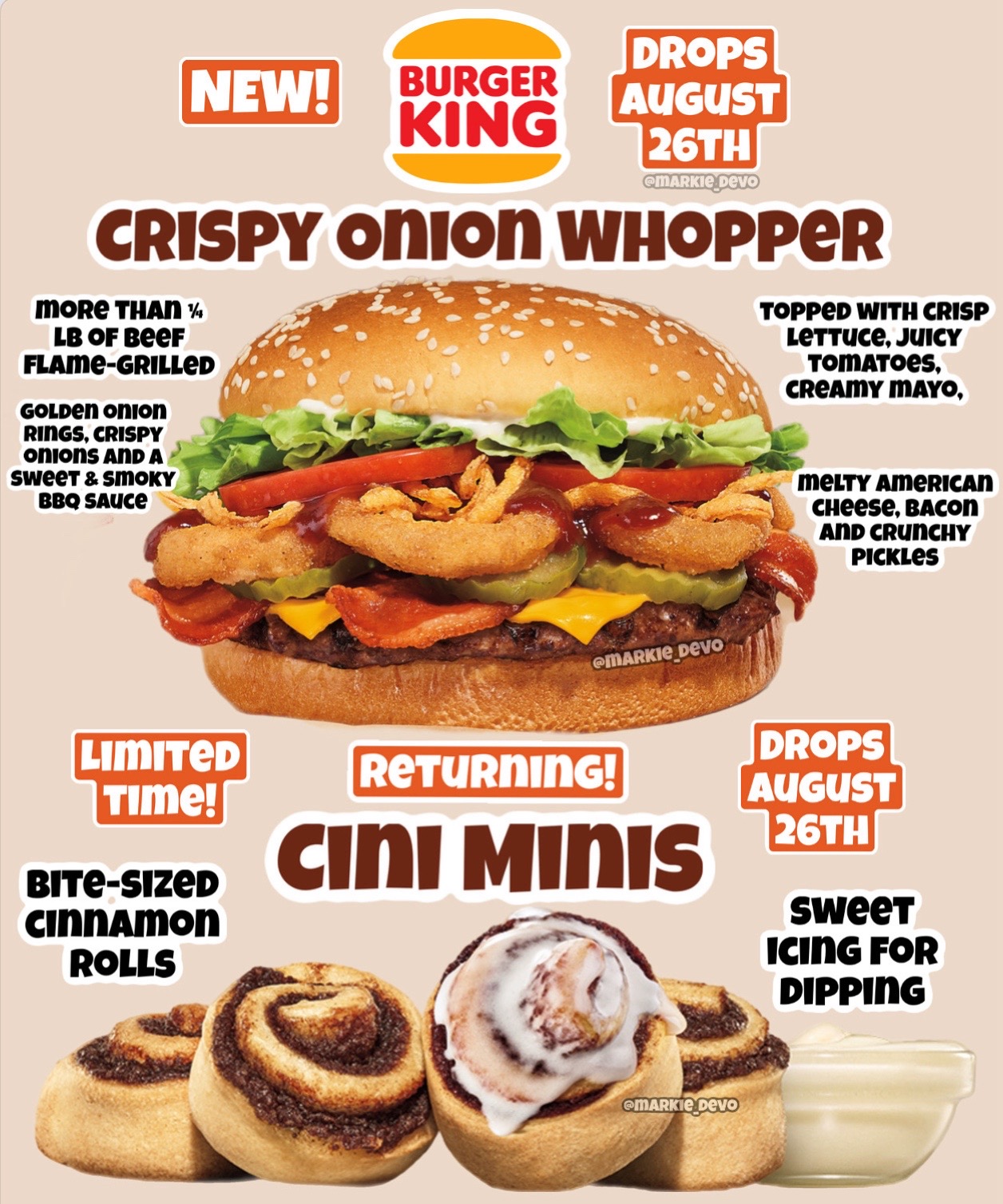 Man, thatโs a Rodeo Burger Deluxe(If you know you know).๐ค ๐ Burger King drops a new Whopper and brings back a fan favorite dessert. -NEW Crispy Onion Whopper::features more than 1โ4 lb of beef flame-grilled to perfection topped with crisp lettuce, juicy tomatoes, creamy mayo, melty American cheese, bacon and crunchy pickles with golden onion rings, crispy onions and a sweet & smoky BBQ sauce. -Returning Cini Minis::iconic bite-sized cinnamon rolls served with sweet icing for dipping. ๐Get the both of these goods at participating Burger King locations on August 26th. (News/Image::Burger King) Will you pick these up๐๐ป #burgerking #foodtok #food #foodvlog #foodie