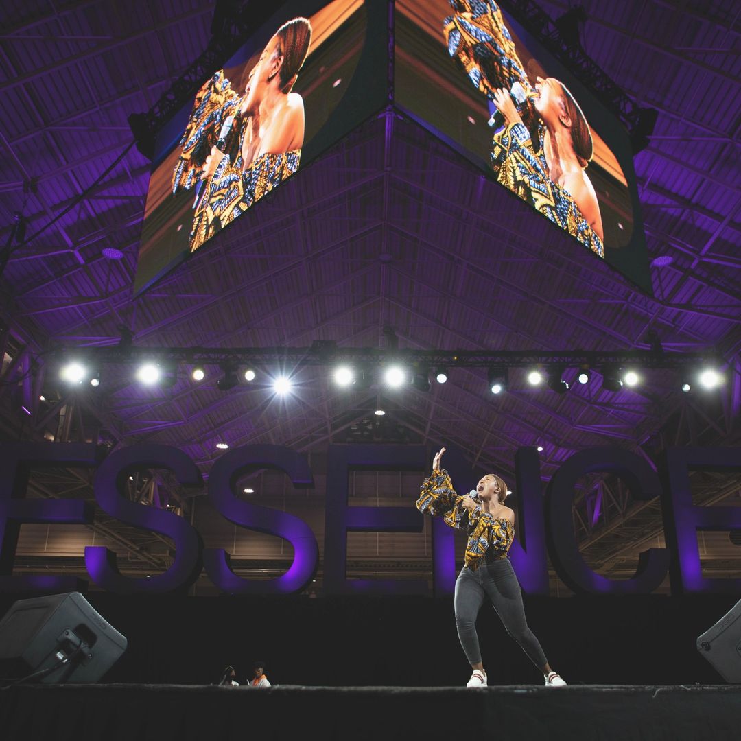 ID: a woman holding a microphone as she sings. She looks outward past the audience in a moment of power. On the second slide, a man holds a microphone on the same stage as he smiles towards the audience down below.