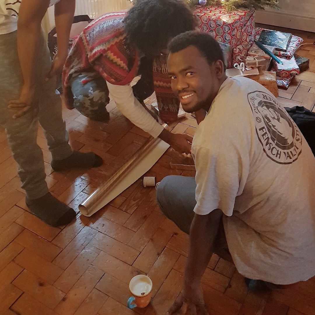 This is my friend Bakhid wrapping Christmas presents at our house a few years ago. After meeting him in the Calais Jungle in 2015, he has gone on to gain his asylum and pursue his education, and he is moving to Edinburgh today to start at Edinburgh college 👏