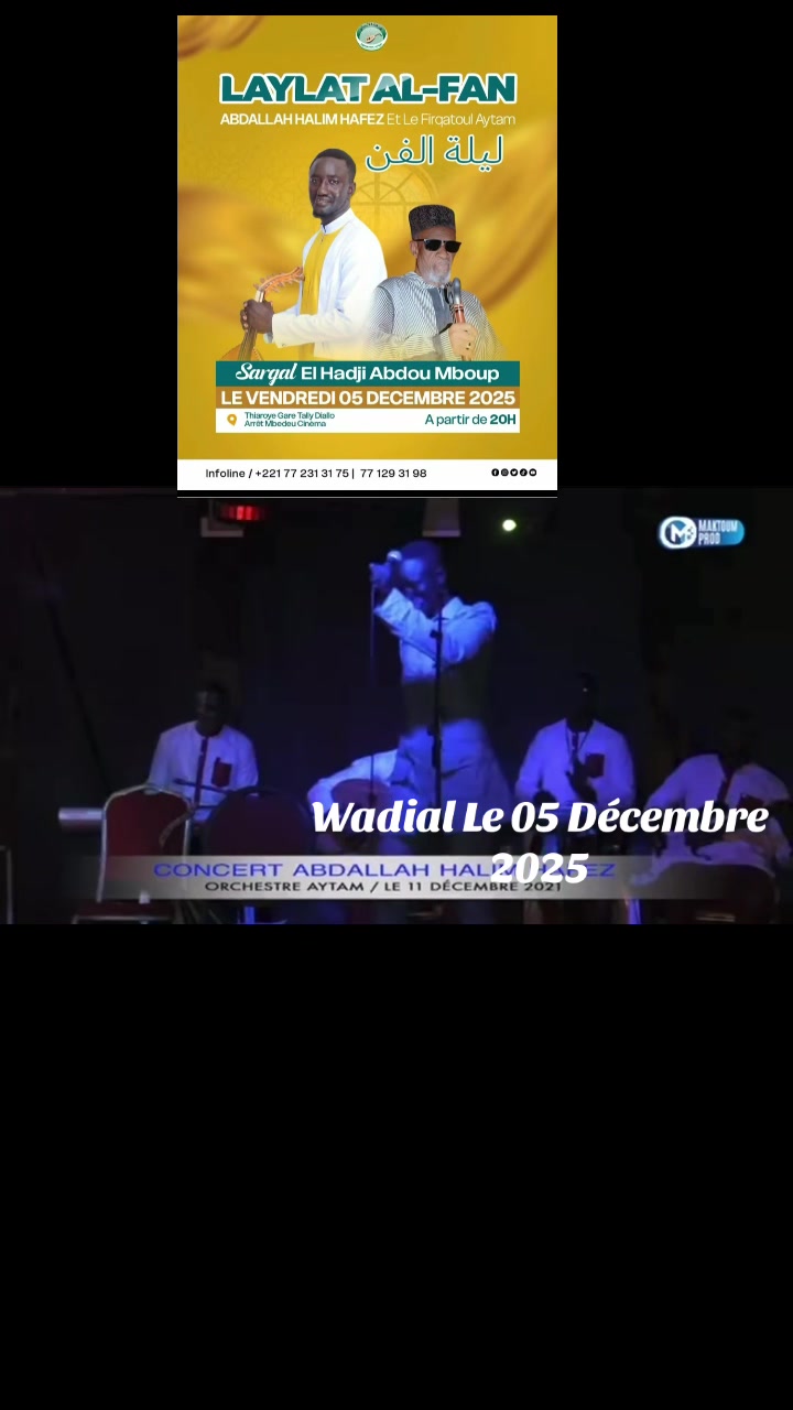 🎉LAYLAT -AL FAN - CONCERT AFRO-ORIENTAL 🎉 À l’occasion de son anniversaire, l’artiste à la voix céleste ABDALLAH HALIM HAFEZ vous @Ahmadiya Events @MLK-Records @chanteur du peuple 776058533 @Ousmane noel Dieng @♥️KHALIL.B.S.MOUSTAPHA.SY♥️ @Fatima Gueye @@KHALIFA @titafall5 convie à un grand concert unique, placé sous le signe de l’hommage à EL HADJ ABDOU MBOUP, illustre dignitaire et homme de sagesse. 📅 Date : vendredi 05 Décembre 2025 📍 Lieu : Thiaroye Gare, Tally Diallo – Arrêt Mbendou Cinéma Infoline : 77 231 31 75 / 77 129 31 98 #AbdallahHalimHafez #FirqaAytaam #ConcertAfroOriental #05Décembre #Thiaroye MbendouCinéma El Hadj Abdou Mboup