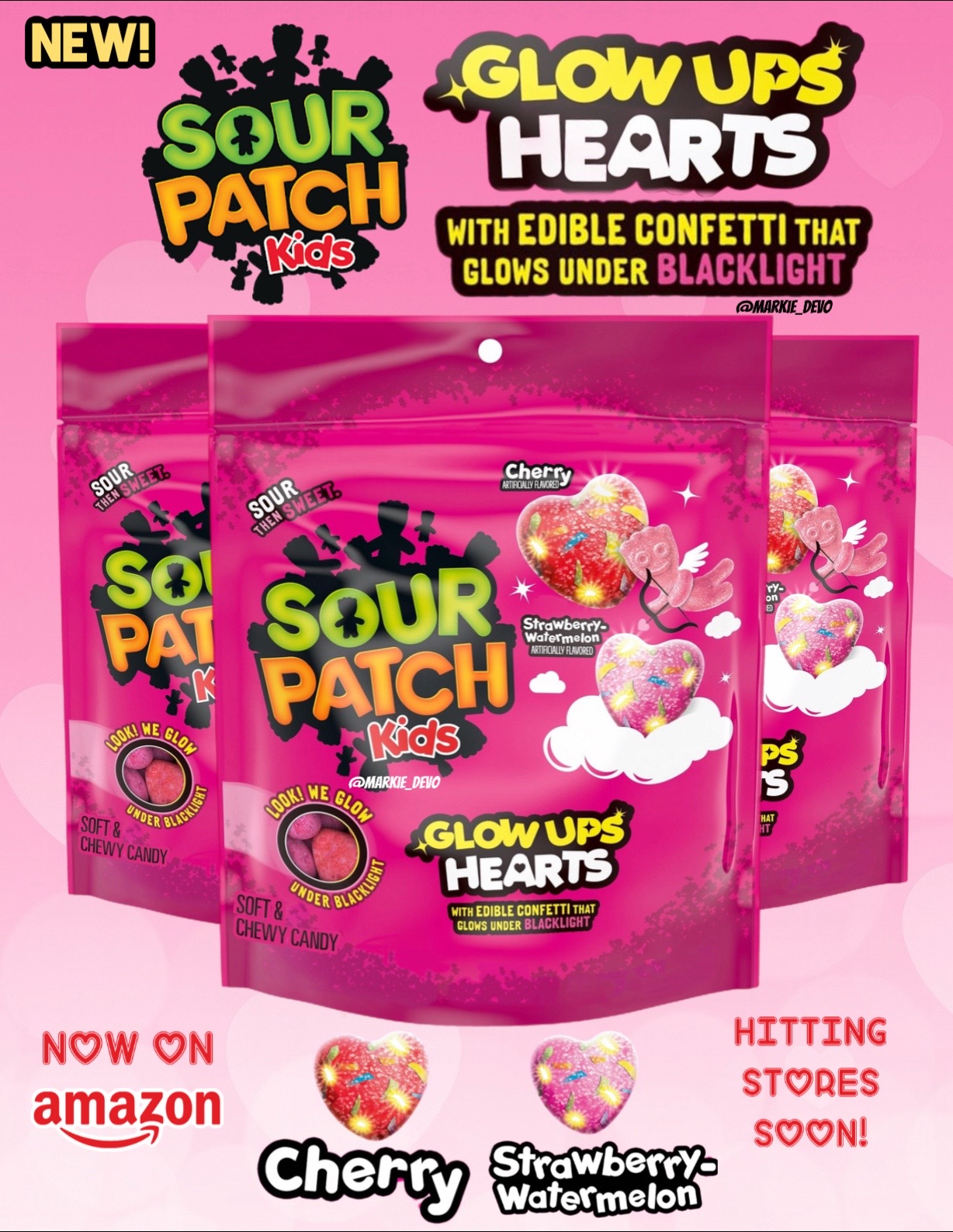 There’s no better way to confess your love than with a bag of glowing sour candy hearts.🥵 New Sour Patch Kids Glow Ups Hearts! Sour heart candy that glows under blacklight. Glow Ups Hearts are soft, chewy heart-shaped gummies that come in fruity flavors Cherry and Strawberry Watermelon. Each piece is topped with edible confetti that glows under blacklight. 📲Available now on Amazon (afiliate link)>>amazon.com/shop/markie_devo 🛒Hitting major stores soon. I’ll update as found. (News/Image:store manager, Amazon) Thoughts👇🏻 #sourpatchkids #food #foodtok #foodtiktok #foodie