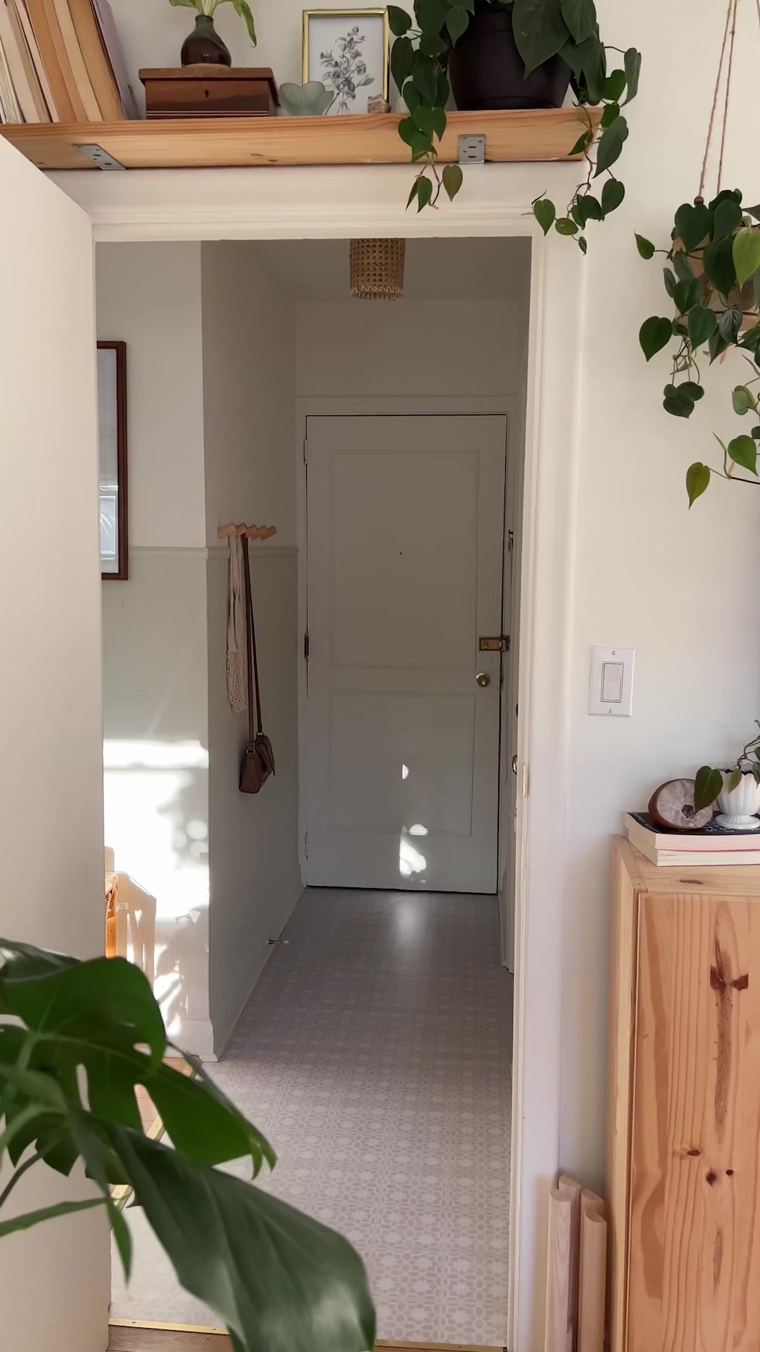 Completed Entryway Makeover! Flooring from Chasing Paper ✨🌸 #entryway #homedecor #peelandstickflooring #boho #houseplants #peelandsticktile