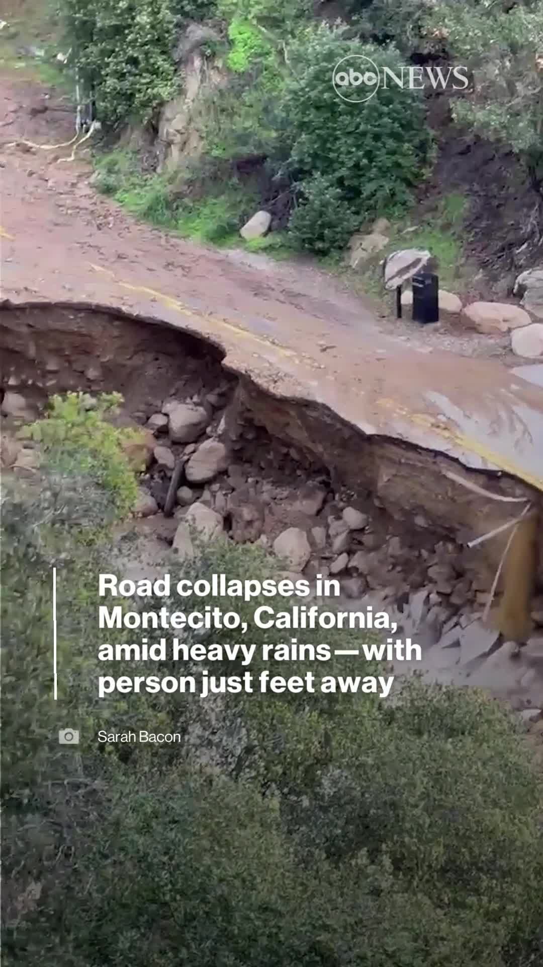 Footage captures the terrifying moment a chunk of road collapsed after heavy rains in Montecito, California, this week—as a person stood just feet away. MORE AT LINK IN BIO.