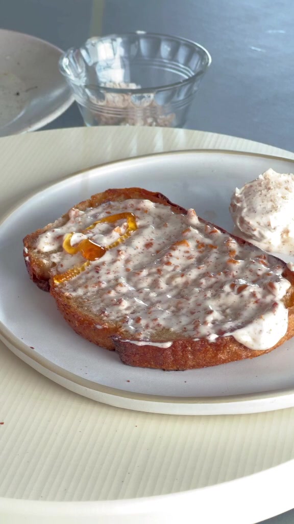You can elevate anything with a little love and elbow grease.I grew up eating toast with butter and honey. It's one of the most comforting flavours. If you think that combination works, try out this whipped brown crunchy garlic butter with honey on sourdough.Melt down a stick of good quality butter, stir it occasionally. Add in a tsp of grated garlic. Once it's starts developing a light caramel color, take off the fire and place immediately in a bowl, on top of another bowl filled with ice. Whisk, whisk and whisk, until it gets colder and fluffy. This will take about 15mins. Mix in 1 tbsp of crunchy garlic (equal amounts of garlic and olive oil, heat it all up until crunchy). Fluff up. Toast bread (brush on some olive oil before going into your pan). Season with flaky salt. Spread. Top with a raw fruity honey.