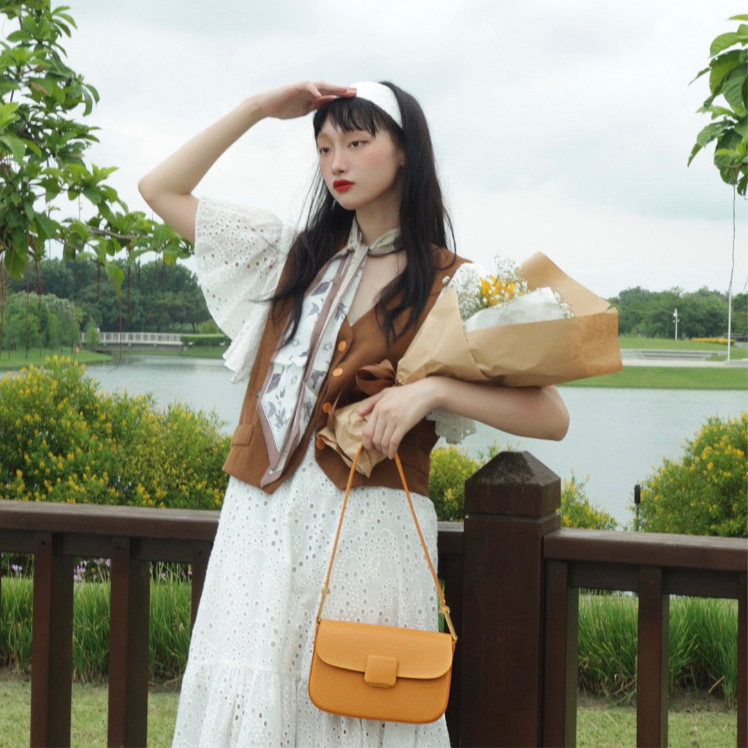 Model @venuskiki completes her boho-chic ensemble with our Koa Square Push-Lock Shoulder Bag in muted orange, and a bouquet of flowers in her arms.