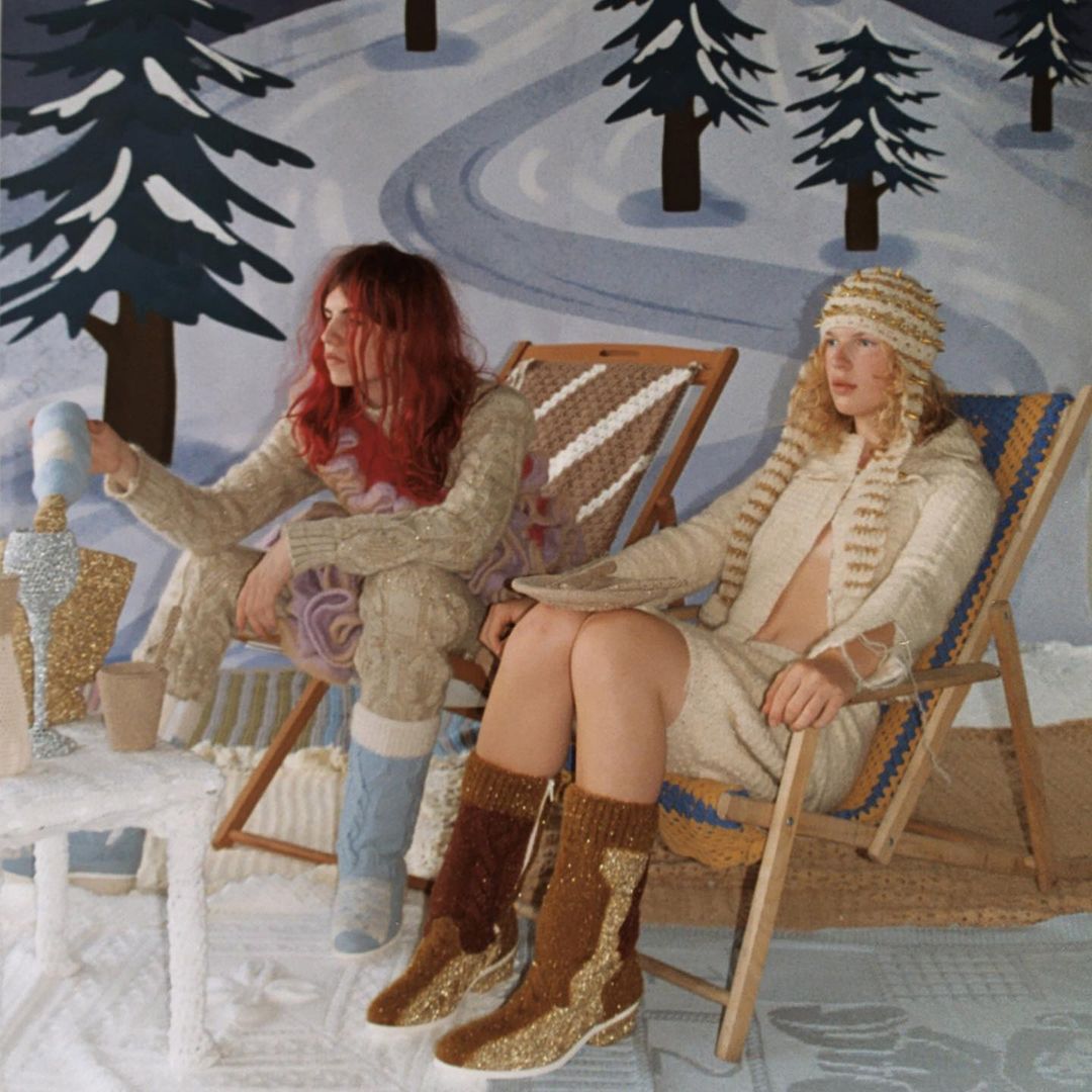Sam and Freddie in the crocheted chaise longues popping a crocheted champagne bottle xx 🏔☀️⛱🍾