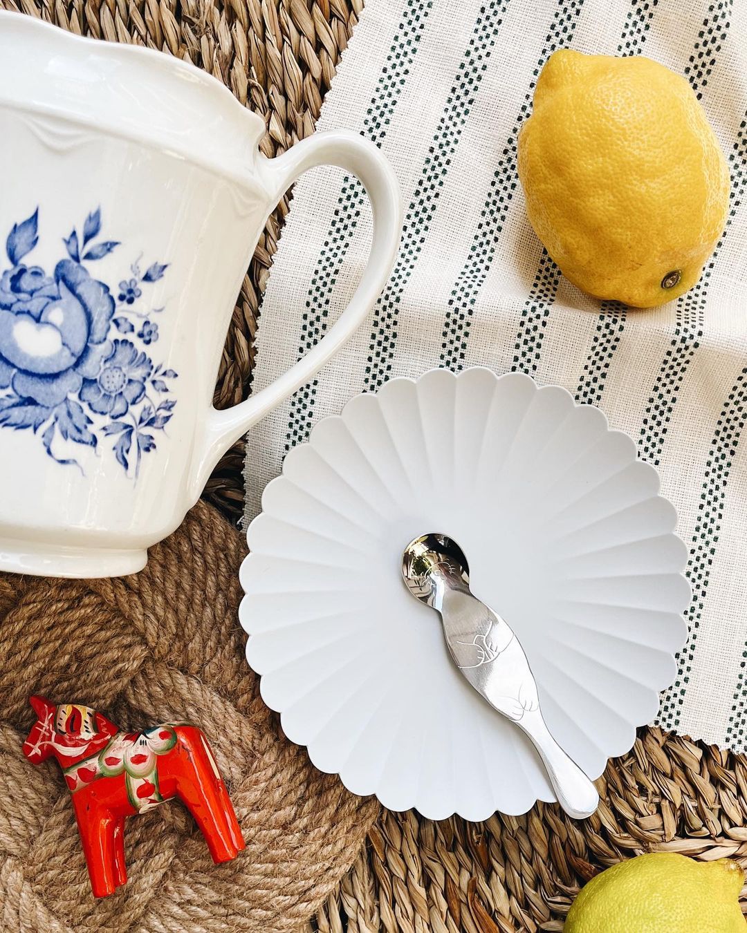 Små ting der giver mit øje glæde ✨ Kanden i porcelæn og den lille dalarna-hest fandt jeg i en genbrug i Stockholm, og de minder mig om en fantastisk tur. Tallerkenen fra Arita har jeg længe ønsket mig, jeg er besat af den bølgede muslingekant og bordskåneren i flet, har også stået højt på ønskelisten. Den lille sælske elsker mine børn (og jeg). De fine ting er fra @sakura_copenhagen og modtaget i gave 🤍