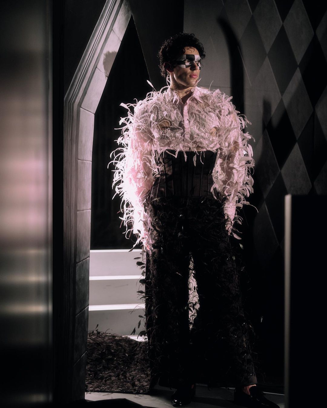 LOOK 15 ... “BOY BRIDE” @joshmcgregor wears tuxedo shirt in pale pink silk taffeta, hand-embroidered with feathers, and reverse-appliquéd with invisible tulle. Underbust corset in black satin. Wide-leg trousers and bow train in quilted black satin, featuring black feathers and allover silk yarn and sequin embroidery.