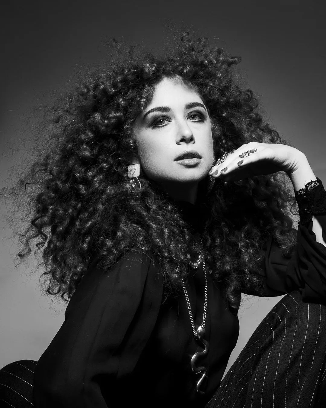 #blackandwhitephotography #blackandwhite #natashalyonne #bigcurlyhair #smokeyeye #thriftfashion