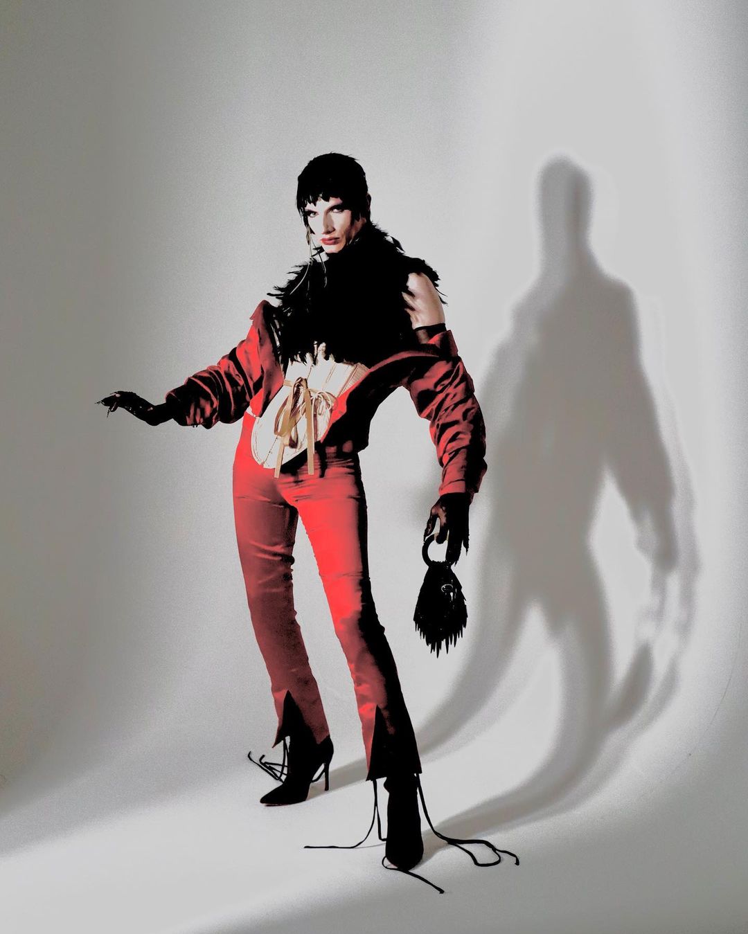Here Rosacea wears the Dior Vogel look with vintage inspired corset, feathered vest and wig