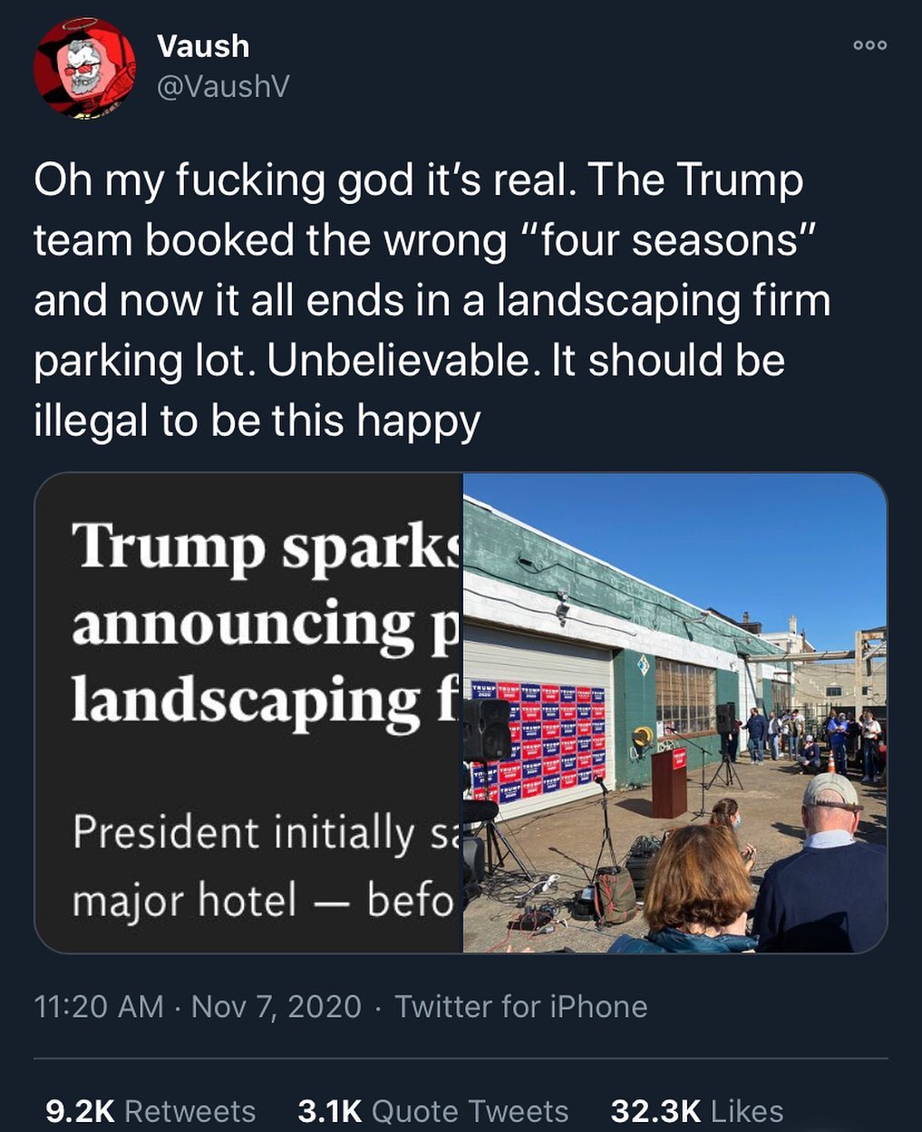 Reminds me of being on tour and going to the wrong double tree that was two blocks away. Kind of like saying you need a lawyer and getting @therudygiuliani