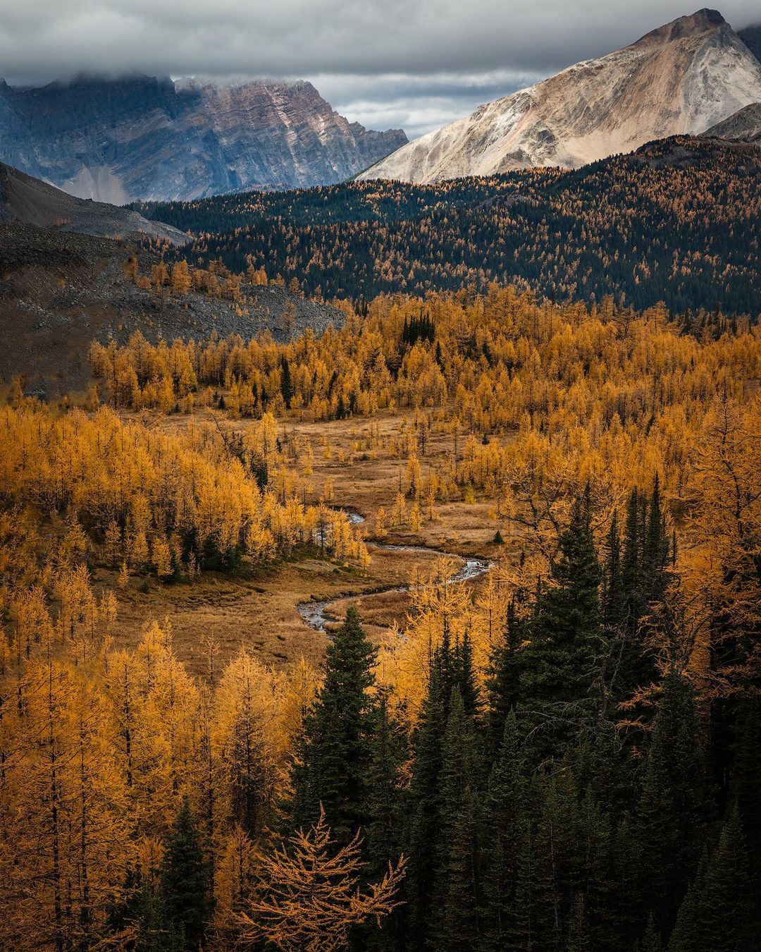 This was taken on a trip to Assiniboine last year, at this time. We just missed the peak of the vibrant colours but I think I'd be hard pressed to find a better concentration of alpine larches. The creek in the center anchors the image.
