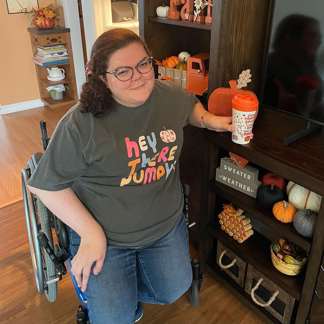 First pic: I’m smiling, sitting in my manual wheelchair in front of shelves with lots of fall decor. My hair is in a side ponytail with a maroon scrunchie that has pumpkins on it and I’m wearing jeans and gray t-shirt that says “hey there pumpkin” in multicolored letters and has a little white pumpkin with orange stars on it. I’m holding a white cup with an orange lid that says “if loving pumpkin spice is wrong, I don’t want to be right.”
