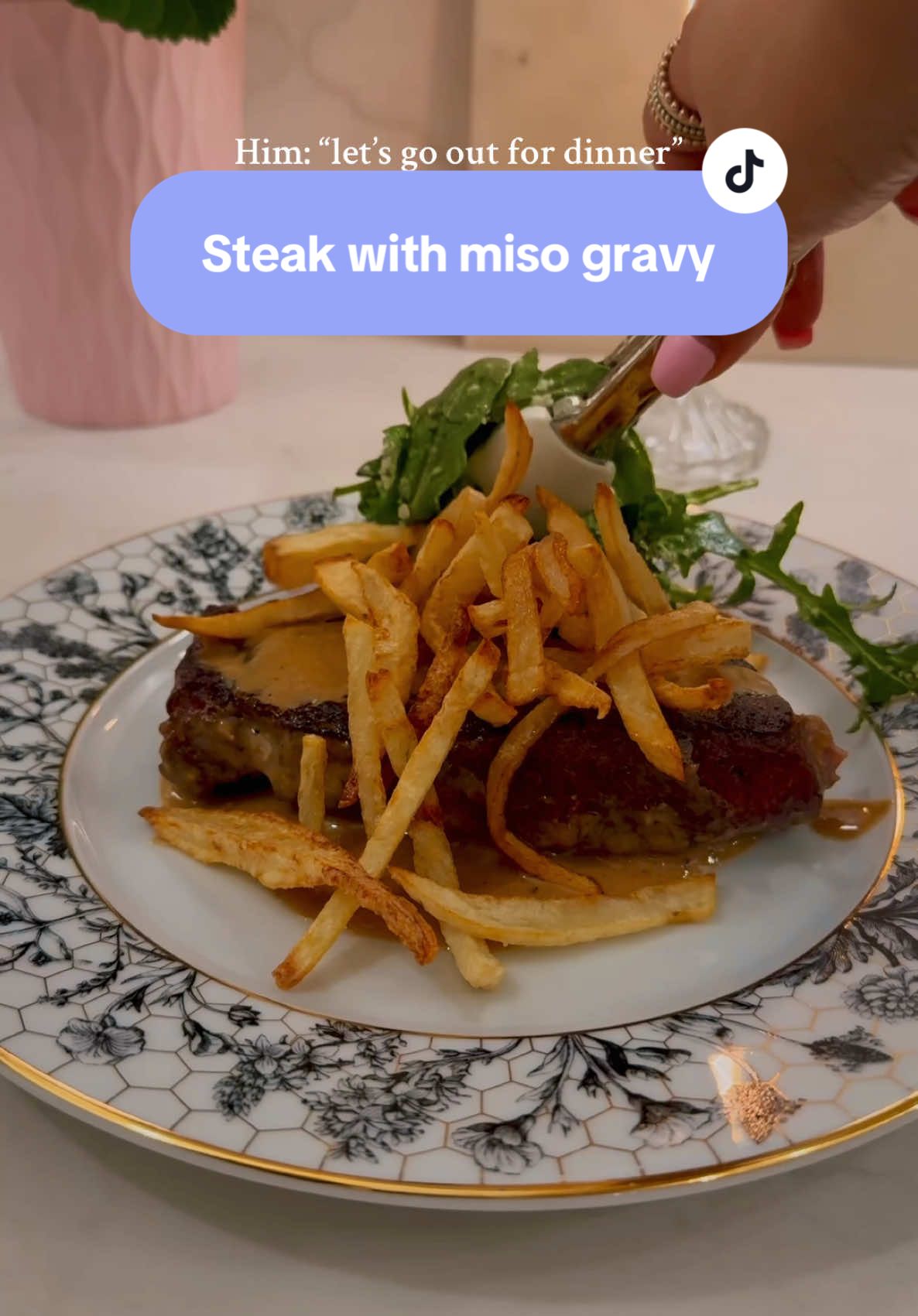 Hi 👋🏽 I like food and cute kitchen gadgets. Let’s be friends 🥰 recipes always 👇🏽 Steak & fries w/miso gravy Steak with miso gravy recipe: For the steak ✨2 10oz ribeye ✨salt & pepper to taste ✨1 Tablespoon olive oil or avocado oil ✨1 Tablespoons butter ✨1 clove garlic To make the miso gravy ✨2 Tablespoons of butter ✨2 Tablespoons of miso paste ✨ 1/4 teaspoon better than bouillon ✨1/4 cup heavy whipping cream ✨1/4 cup of water 1. Generously season your steak with salt and pepper on both sides. 2. Rub olive oil on both sides of the steak. 3. Heat a stainless steel pan over medium high heat until fully hot. 4. Place the steak in the pan and let it cook undisturbed for exactly 4 minutes. 5. Turn the steak onto its fat cap and sear each side of the fat cap for 1 minute. 6. Flip the steak to the other side and cook for an additional 4 minutes without touching it. 7. Lower the heat, add butter and garlic, and baste the steak for 2 minutes. This timing gives me a perfect medium steak. If you prefer yours more well done or medium rare, adjust the cooking times accordingly. 8. Remove steak from the pan set aside and start on your gravy. To the pan add butter, miso paste, Better Than Bouillon, heavy cream, and a splash of water. Stir until a gravy forms. If the sauce is too thick, add more water to thin it out. 9. Taste the gravy and adjust salt if needed. 10. Turn off the heat, place the steak back in the pan, and let it rest. 11. Serve and enjoy Arugula salad ✨arugula ✨honey ✨lemon ✨Dijon mustard ✨evoo ✨salt and pepper ✨Parmesan cheese #steakdinner #cookwithme #steakandfries #homemade #finediningathome #steak #fries #recipes #inmykitchen #miso