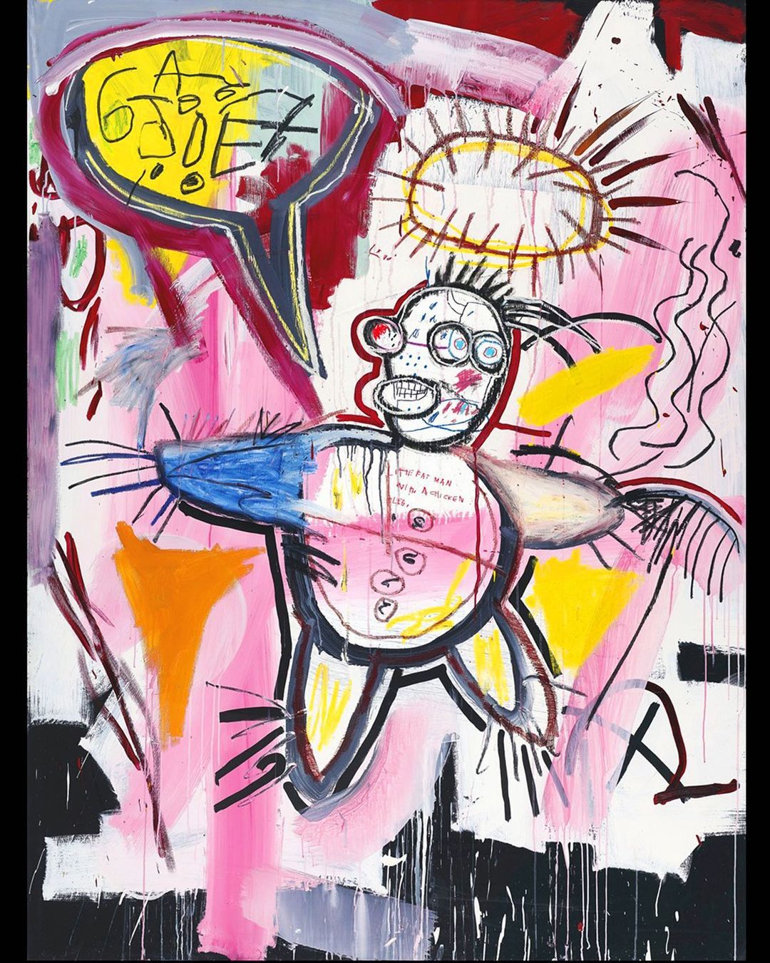 “Whether the figure makes for a martyr, voodoo effigy, self-portrait or a jab at the overstuffed 1980s art world is an open question; like the speech bubble’s unreadable marks, he is indisputably loud yet ultimately ambiguous. A masterclass in Basquiat’s collisions of art history, the work is anchored by its architectonic color and electrified line, which come together to form a vividly charged and enigmatic picture.” @christiesinc
