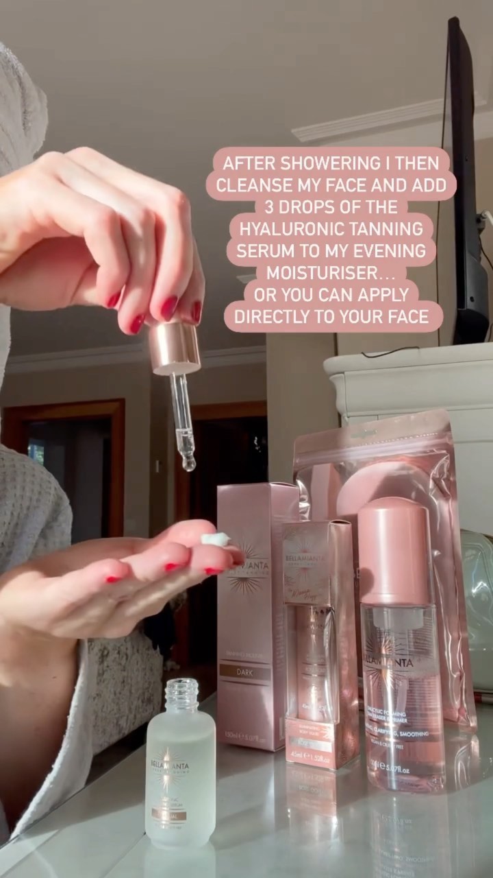 Karen then mixes the Hyaluronic Serum with her moisturiser for a subtle glow. She finishes off by using the Dark Tanning Mousse✨