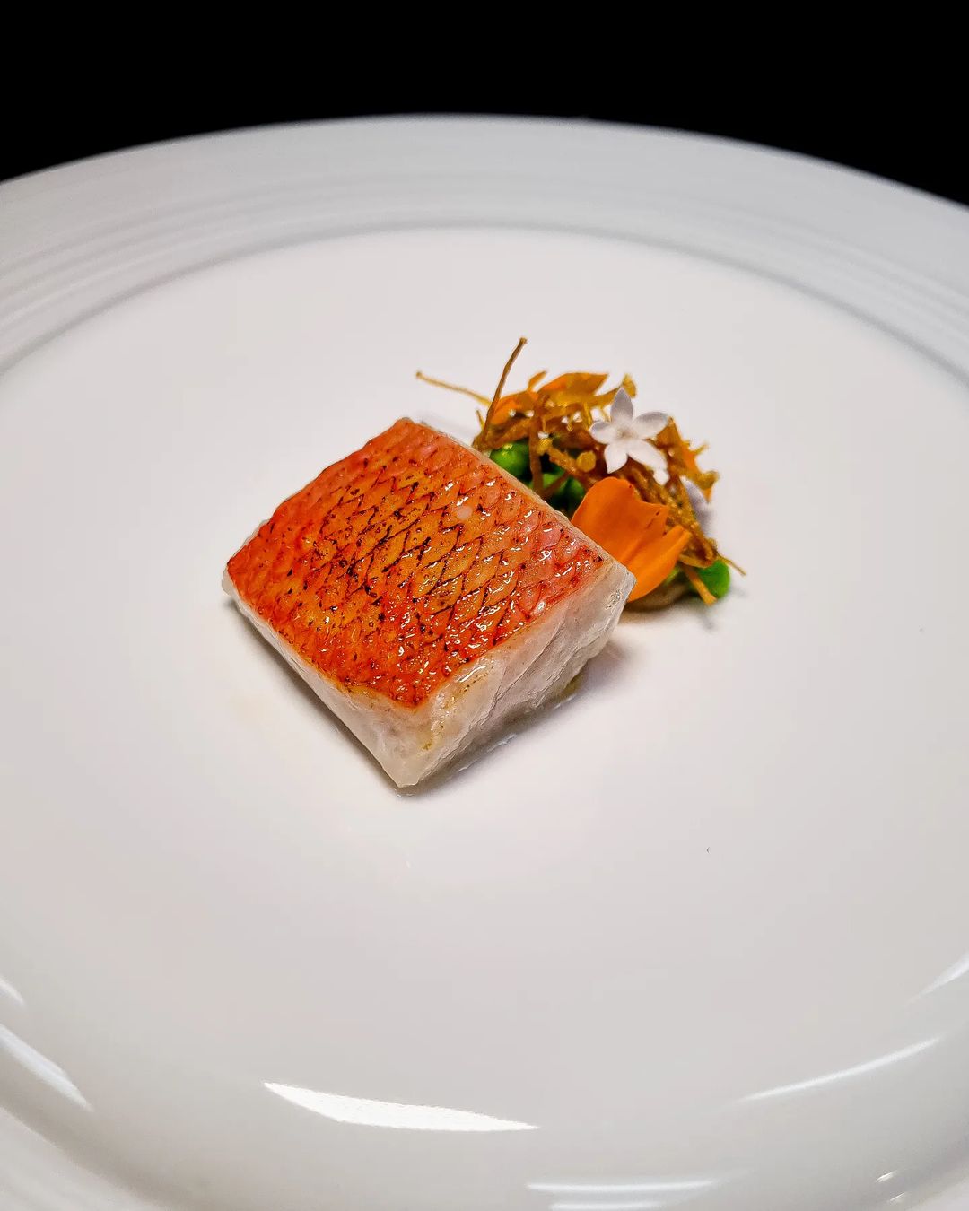 Kinmedai Cooked in Confit Style. Served with Parsnip PureΜe, Petit Pois, Crispy Enoki and Foie Gras Sauce.
