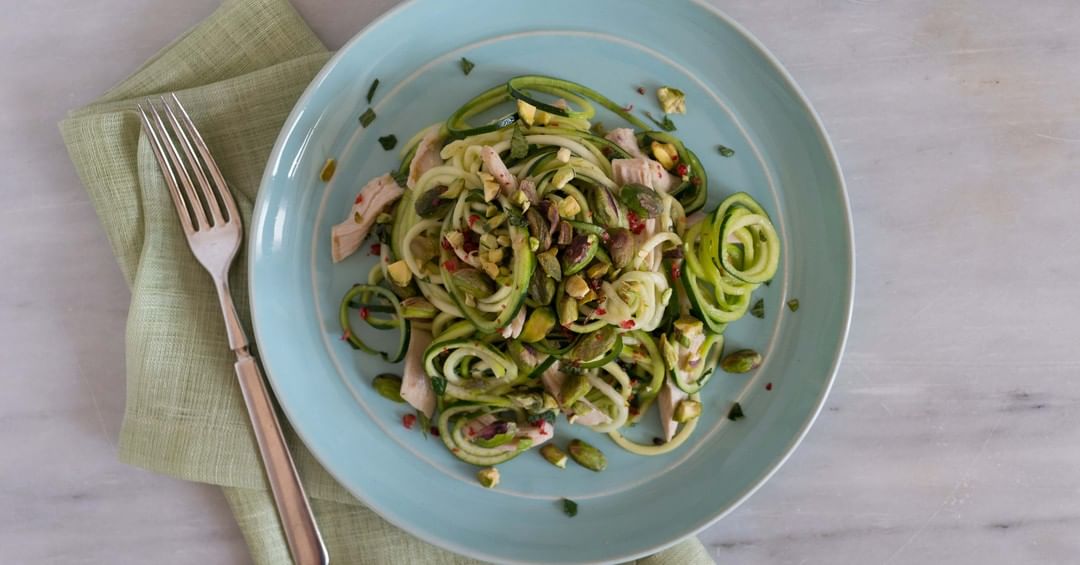 Healthy and delicious! Try our tasty Zucchini Spirals with Wonderful Pistachios, garlic, and chicken that will have you reaching for seconds 😉 Check out the full #recipe at wonderfulpistachios.com 🥬💚