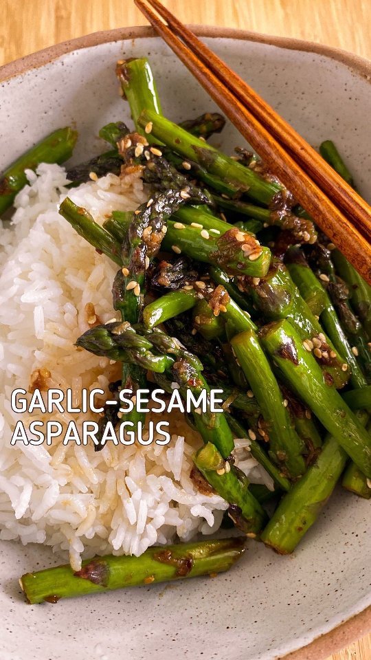 Sauté 3-5 minced garlic cloves in some oil, add bite size chopped asparagus. Season with sesame oil, light soy sauce, white pepper, chili flakes. Stir-fry over high heat. Add toasted sesame seeds and toss. Add a squeeze of lemon juice and serve with rice or noodles. Don’t fry them for too long, they taste best when still bright green and a little crunchy.🥰