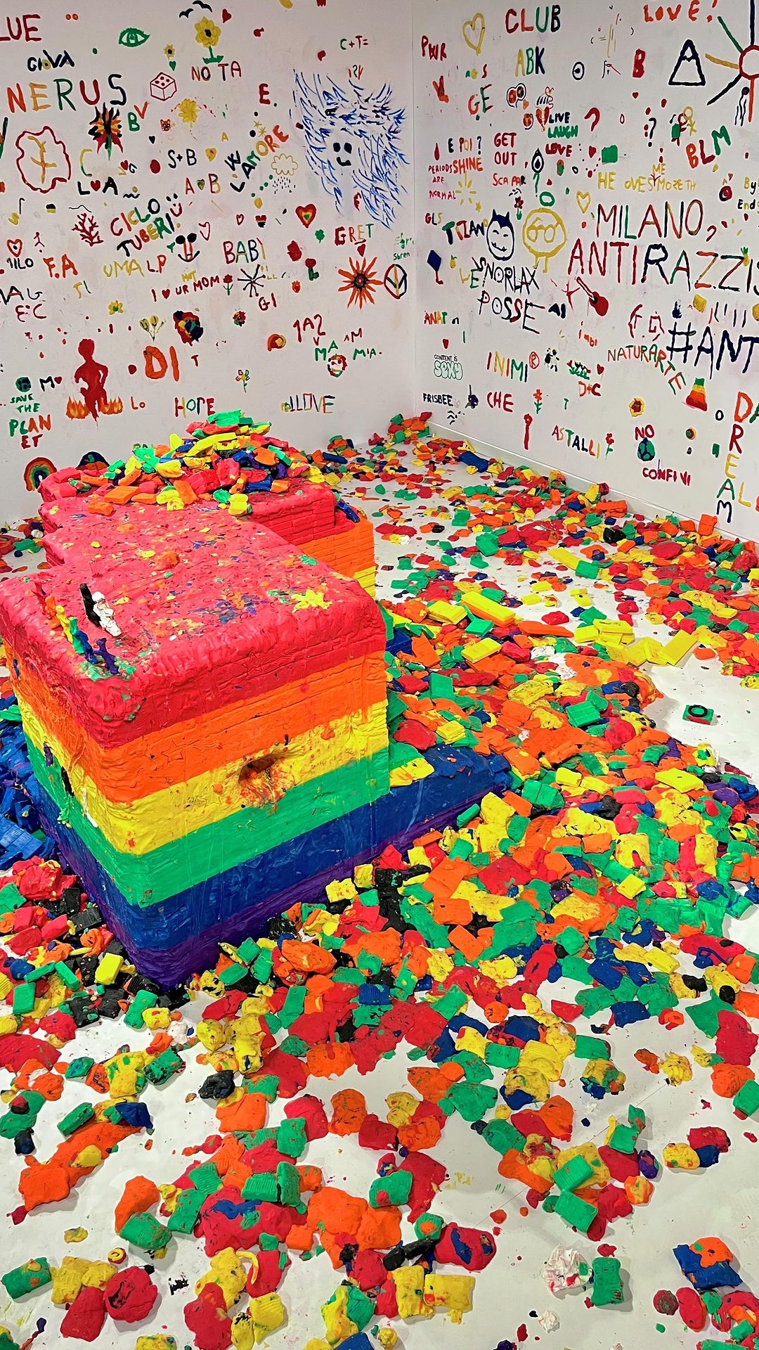 È un parallelepipedo di #plastilina che evoca la bandiera #arcobaleno e nasconde un’intersezione bianca e nera al suo interno. È un’opera collettiva e in fieri, che muta nel tempo e nello spazio grazie alla fruizione continua del pubblico che vi interagisce modellando e rimodellando il materiale di cui è composta, per tutta la durata dell’installazione.