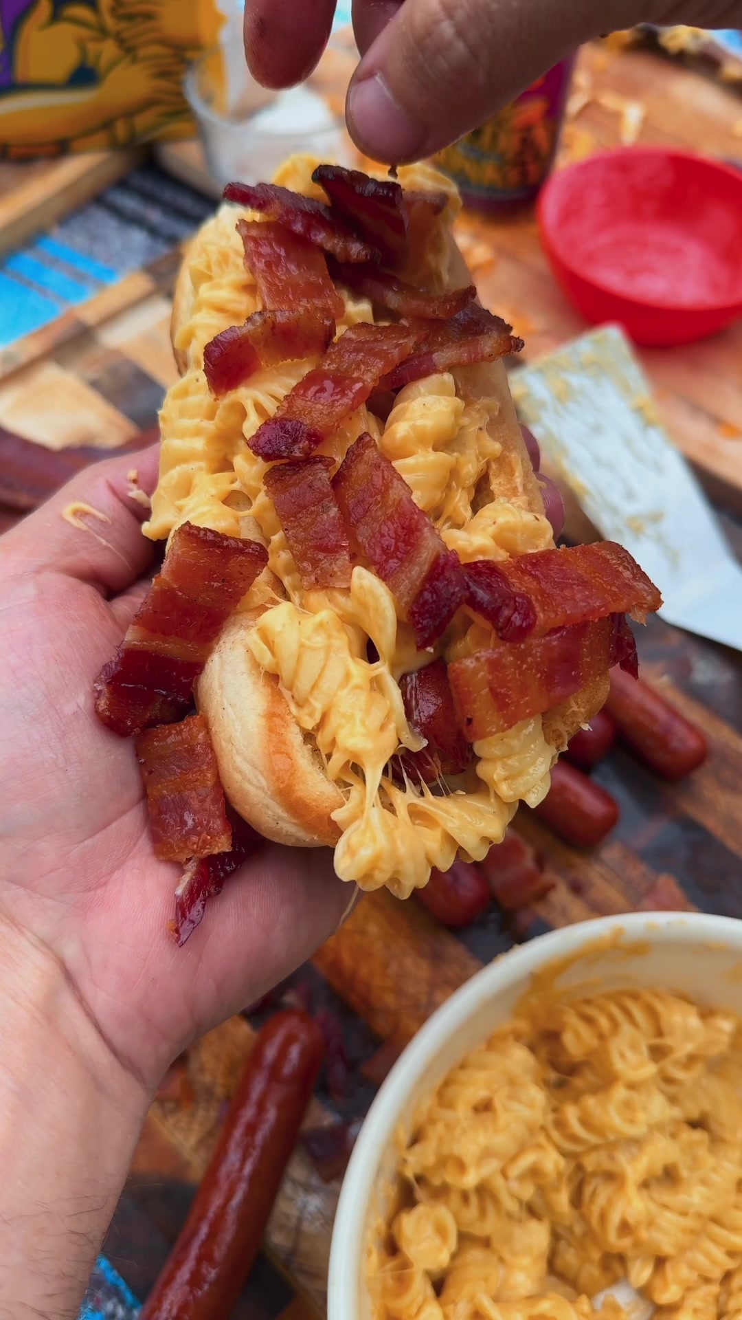 Beer Cheese Mac Hotdogs 🧀🌠Recipe: -Start by making by melting 3 tbsp butter and mixing in 2 tbsp of flour. -Then slowly mix in these ingredients one at a time: 1 tbsp dijon mustard 3/4 cup beer 1.5 cup heavy cream 2 cups shredded sharp cheddar cheese 2 cups shredded Colby jack cheese -Continue stirring until everything is melted. -Add 1 pound of boiled noodles. Mix and salt to taste. -Add to a hot dog and top with chopped bacon. #hotdog #macandcheese #cheese #hotdogs #beercheese