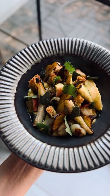 feat. autumn panzanella: roasted citrus spiced pear, apple and, blistered pearl onion, butternut toum, brown butter sage, herb oil, cilantro, maldon