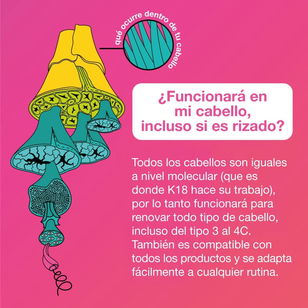 Todos los cabellos son iguales a nivel molecular (que es donde K18 hace su trabajo), por lo tanto funcionará para renovar todo tipo de cabello, incluso del tipo 3 al 4C.