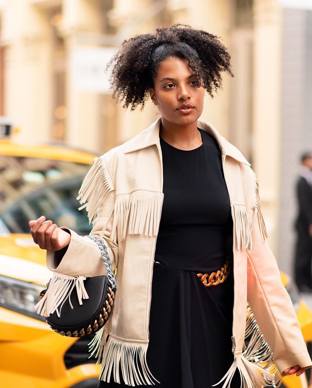 #mylointhewild... Plant-based chef, Tara Thomas (@cheftarathomas) sporting a fringed jacket, chain-waisted shift dress and matching Frayme MyloTM handbag made from mycelium. This head-to-toe look by our long-term partner @stellamccartney is equal parts '70s-era nostalgia and future-forward material innovation.