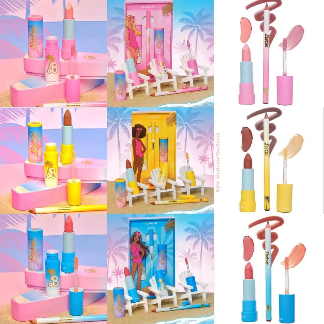 @BarbieTM x Glamlite “Out of Office” Lip Kit is every pink lover’s dream. 💕 This fun lip trio features a soft sparkly pink lipstick, a mauve lip liner and an ultra radiant shimmer pink iridescent gloss to top it all off! 🏄🏿♀️🌊- $20 USD