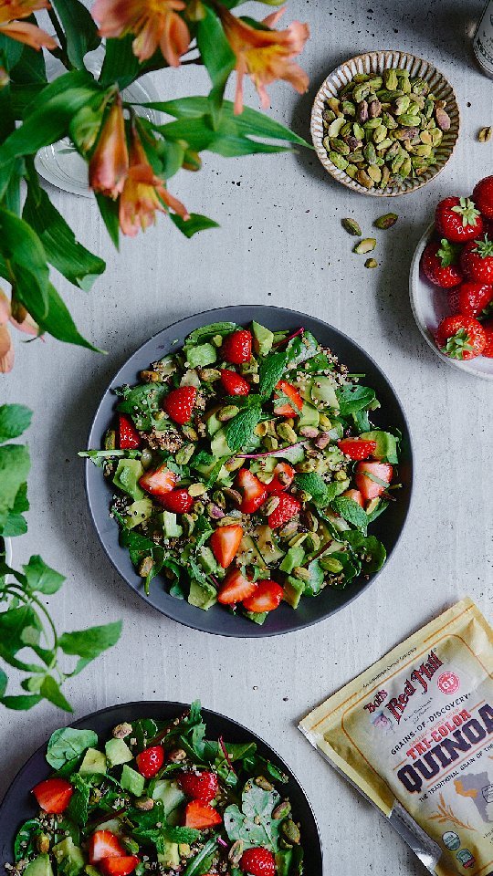 Quinoa summer salad with strawberries, balsamic vinaigrette and pistachios đż Quinoa is probably my favourite gluten free grain and the tri-colour one from @bobsredmill just looks so beautiful in this salad!