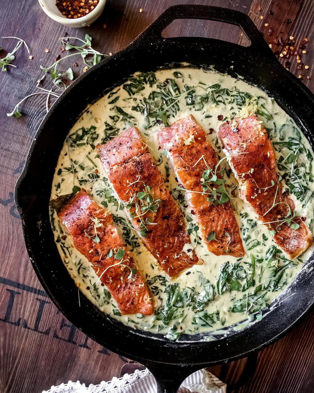 Add salmon back into the pan and bake in the oven for 10-12 minutes until salmon is cooked through. Garnish with micro greens and lemon zest.