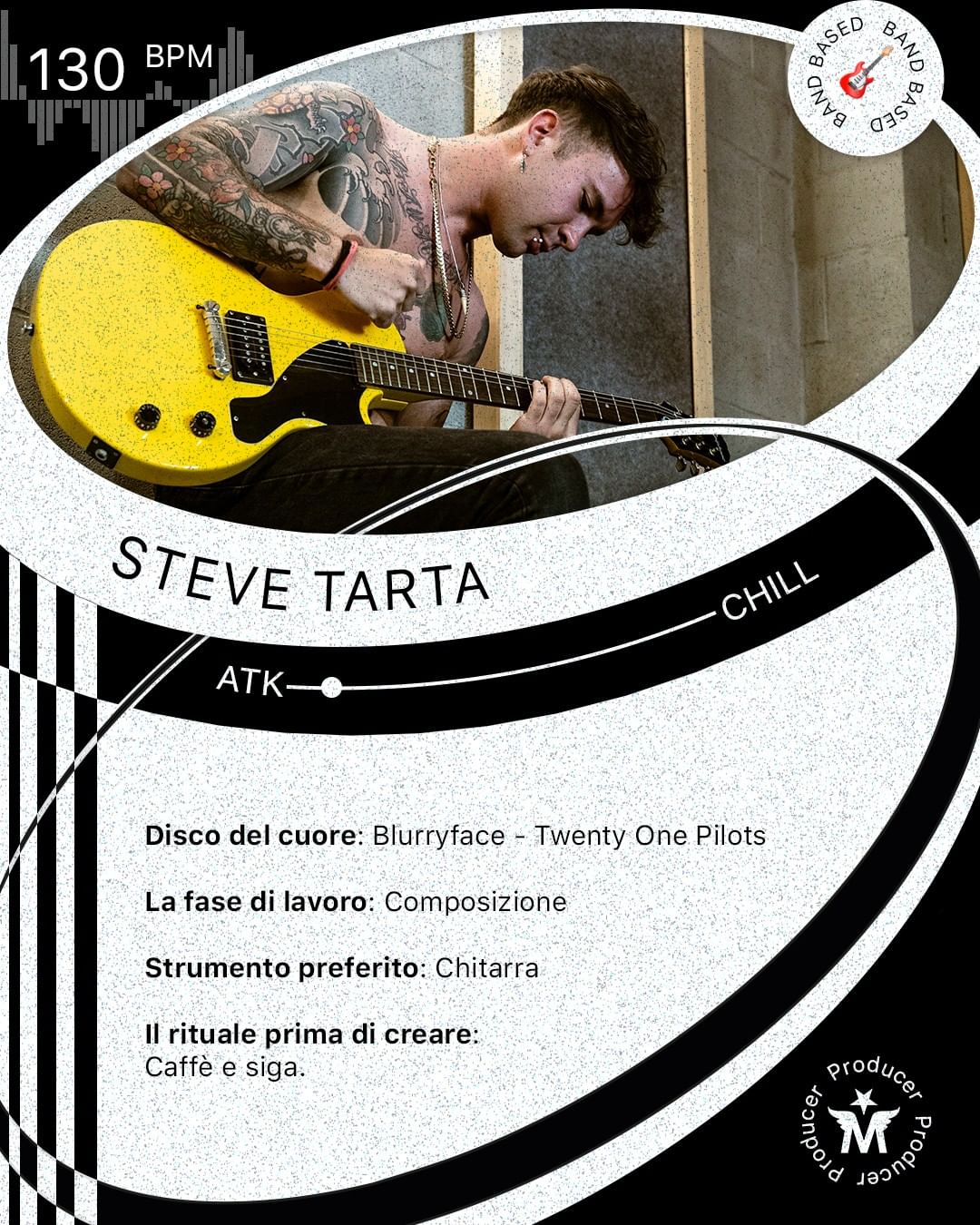 @steve_tarta, classe 96’, nasce come chitarrista nel 2008 quando preferisce una Stratocaster a una PS2. Poi sono arrivati i tour europei con la band Burden is burning, gli anni di studio a Londra, tra chitarra e ingegneria del suono, il lavoro dietro al mixer a Los Angeles e a Torino. È attivo come producer e compositore in svariati progetti.
