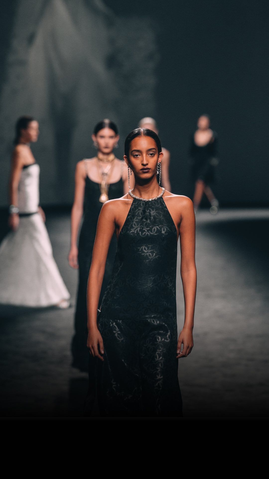 A long, asymmetric halter-neck dress by Virginie Viard in a black jacquard of double C is split high up the leg, tied with a trailing velvet ribbon, and framed at the neck with crystal braids.