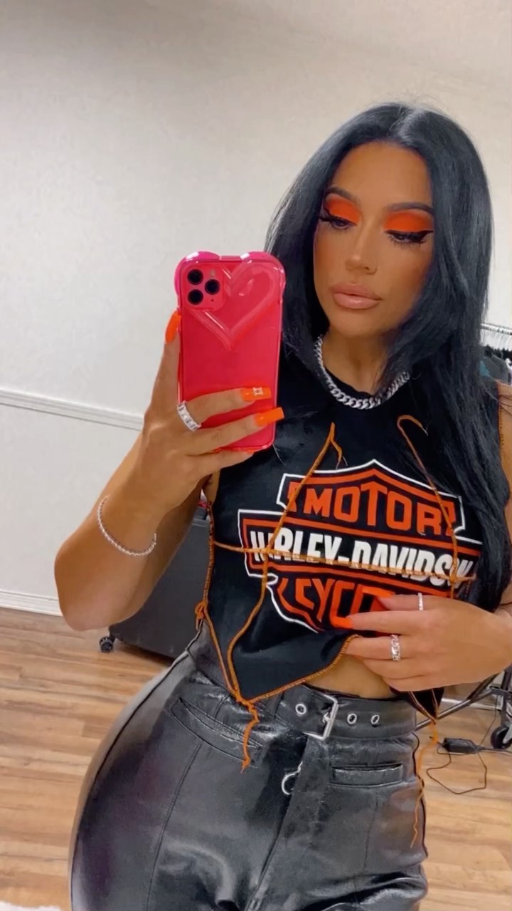 @deelishdeanna in the vintage reworked Harley Davidson top 🧡🖤🧡 click on tagged products or link in bio to shop our new vintage pieces & jewelry !