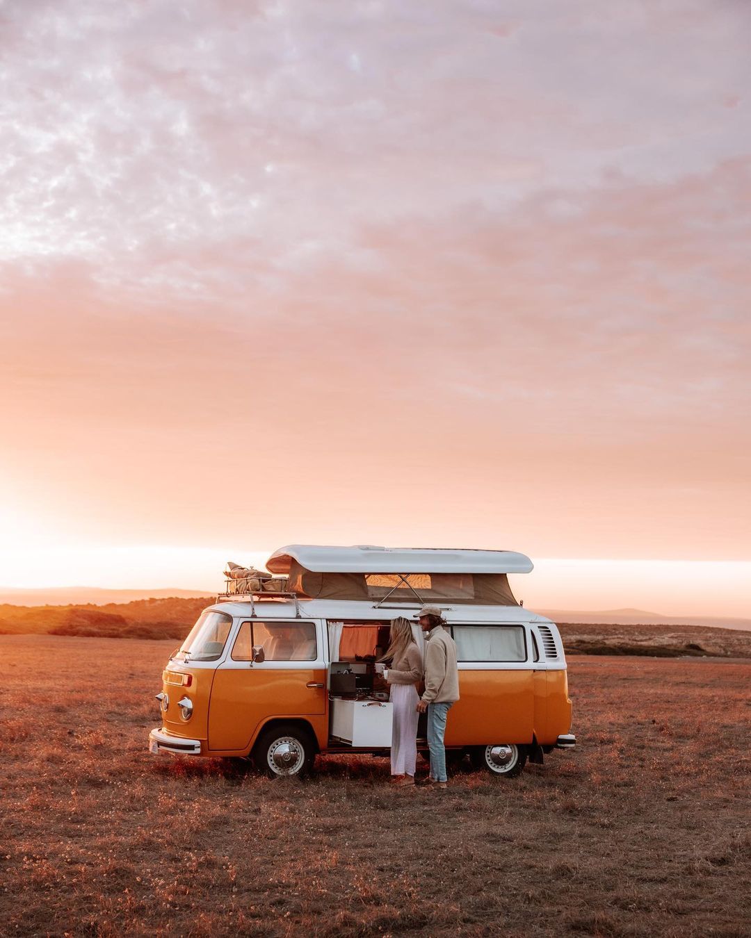 The light shines through our white curtains every morning, we don’t manage to sleep in too often. This particular morning around 6am we woke up to a sky exploding in colour, it even matched the van 😋🌾