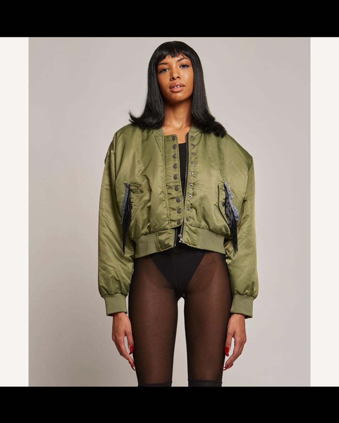 Details:Army green bomber with dropped shoulders and black beading with denim patch on the opening of the pocket.