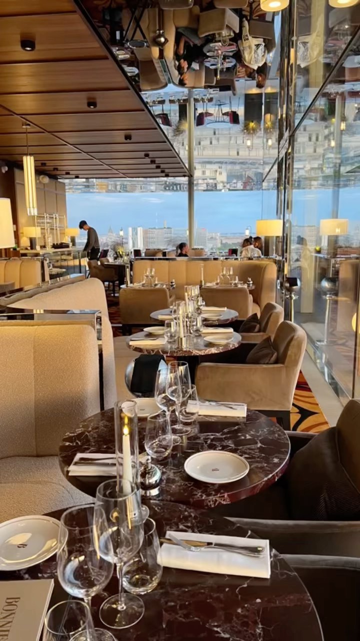 Bonnie restaurant at the top of the new @soparishotel has an unbelievable view amplified by a mirrored installation by @studioolafureliasson that reflects the Seine, angled perfectly so you can see the bateaux mouches reflected from above. Loved the restaurant’s Halston vibe designed by Notoire (and the DJ’s 70s soundtrack...Grace Jones et al). #paris #parisviews #parisnightlife #seine