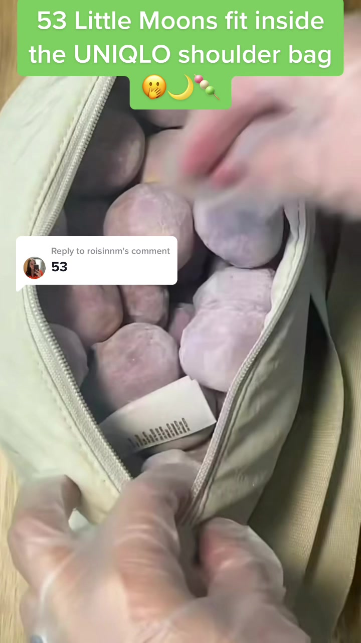 Replying to @roisinnm the winner of a month’s supply of Little Moons and a @uniqloeurope shoulder bag❤️ can you believe how many fit in the bag?😅 #uniqloshoulderbag #LittleMoons
