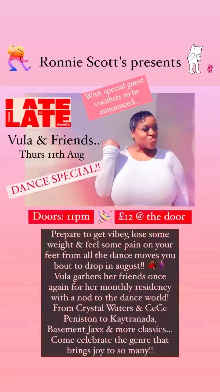Vula & Friends.... DANCE SPECIAL!! Thurs 11th Aug 2022 Ronnie Scott's, London Y'all know what to do.... ππΎπβ¨πͺ©π₯πΊπ½