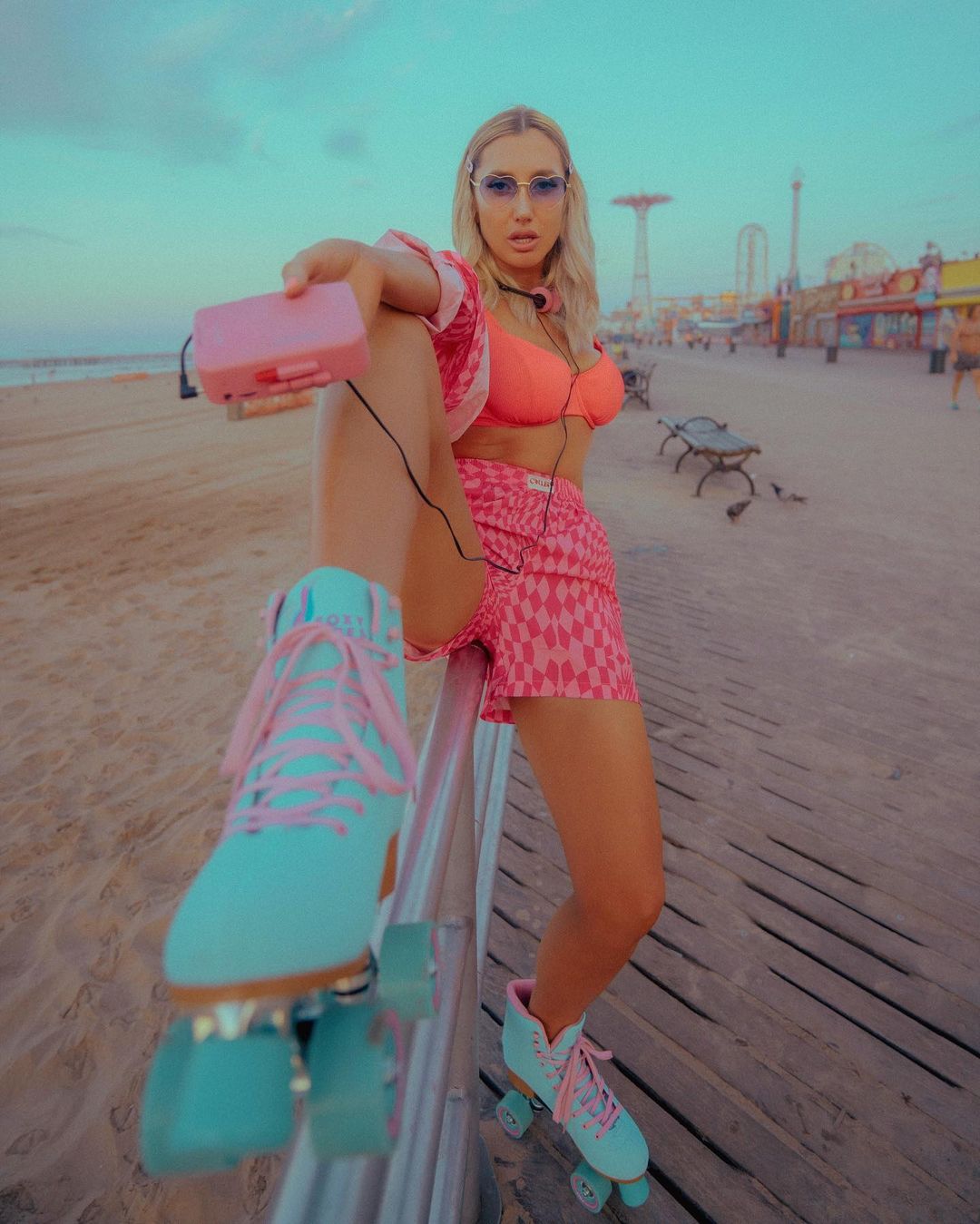 Sunrise with @officialhollyt #coneyisland #retro #rollerskates #cottoncandy #70s #80s #walkman #sunrise
