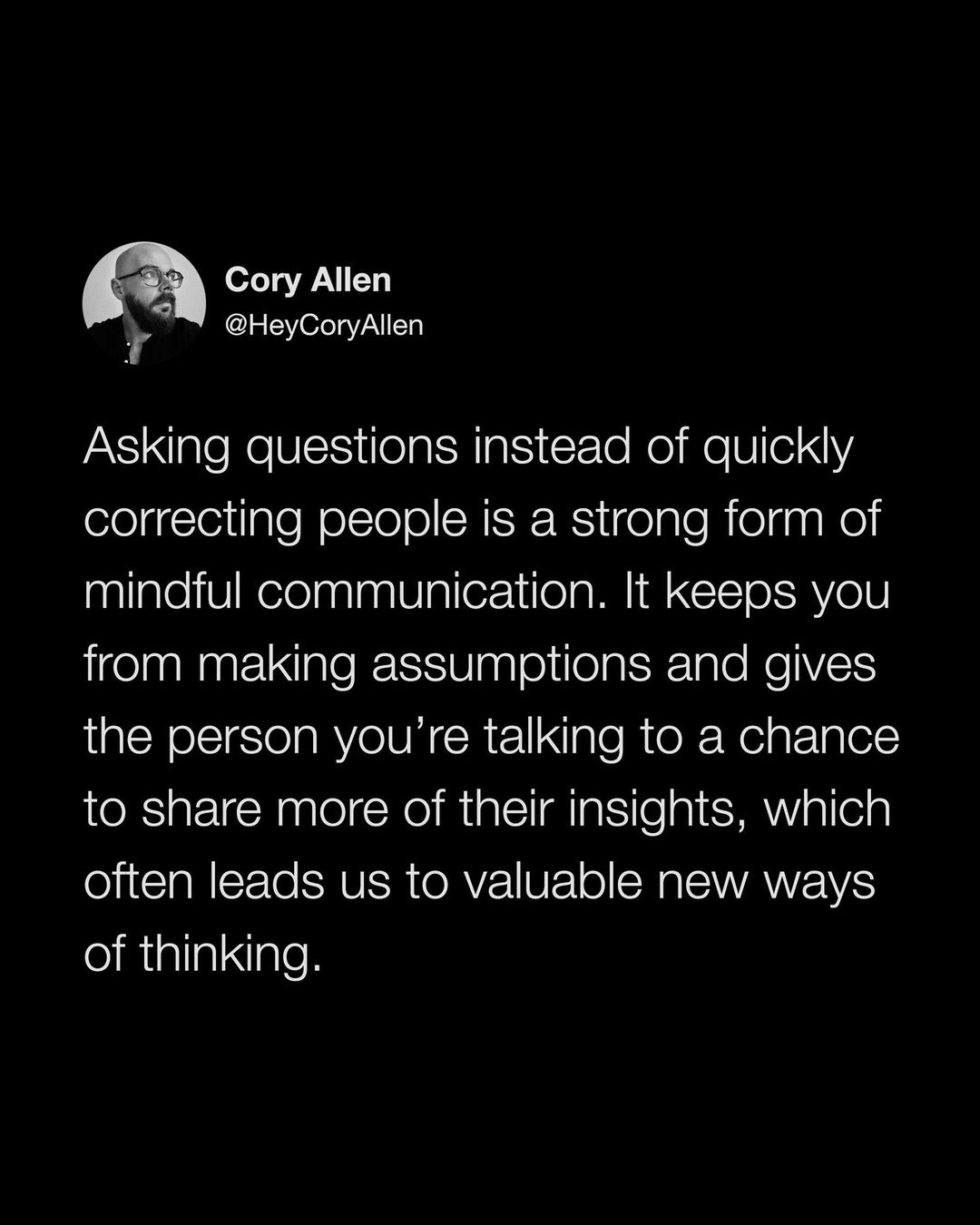 [tweet screenshot; tweet by cory reads: “Asking questions instead of quickly correcting people is a strong form of mindful communication. It keeps you from making assumptions and gives the person you’re talking to a chance to share more of their insights, which often leads us to valuable new ways of thinking.”]