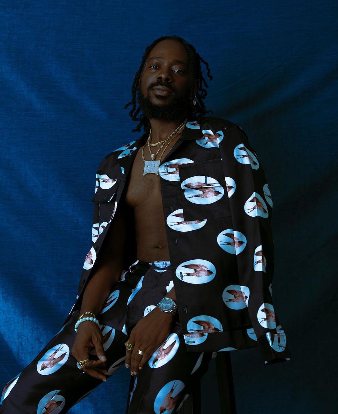 Adekunle Gold in custom two piece Bird print