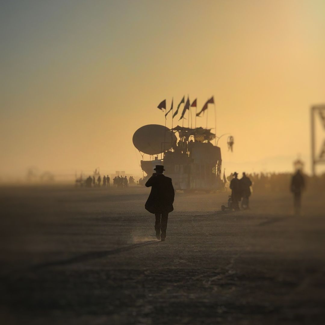 Seen here: A dusty sunrise walk with the Pariah Express and @airpushercollective Mutant Vehicles in the background, 2022 (photo submitted by @powpowcacao) #brc2022 #blackrockcity #brc #burningman #10principles