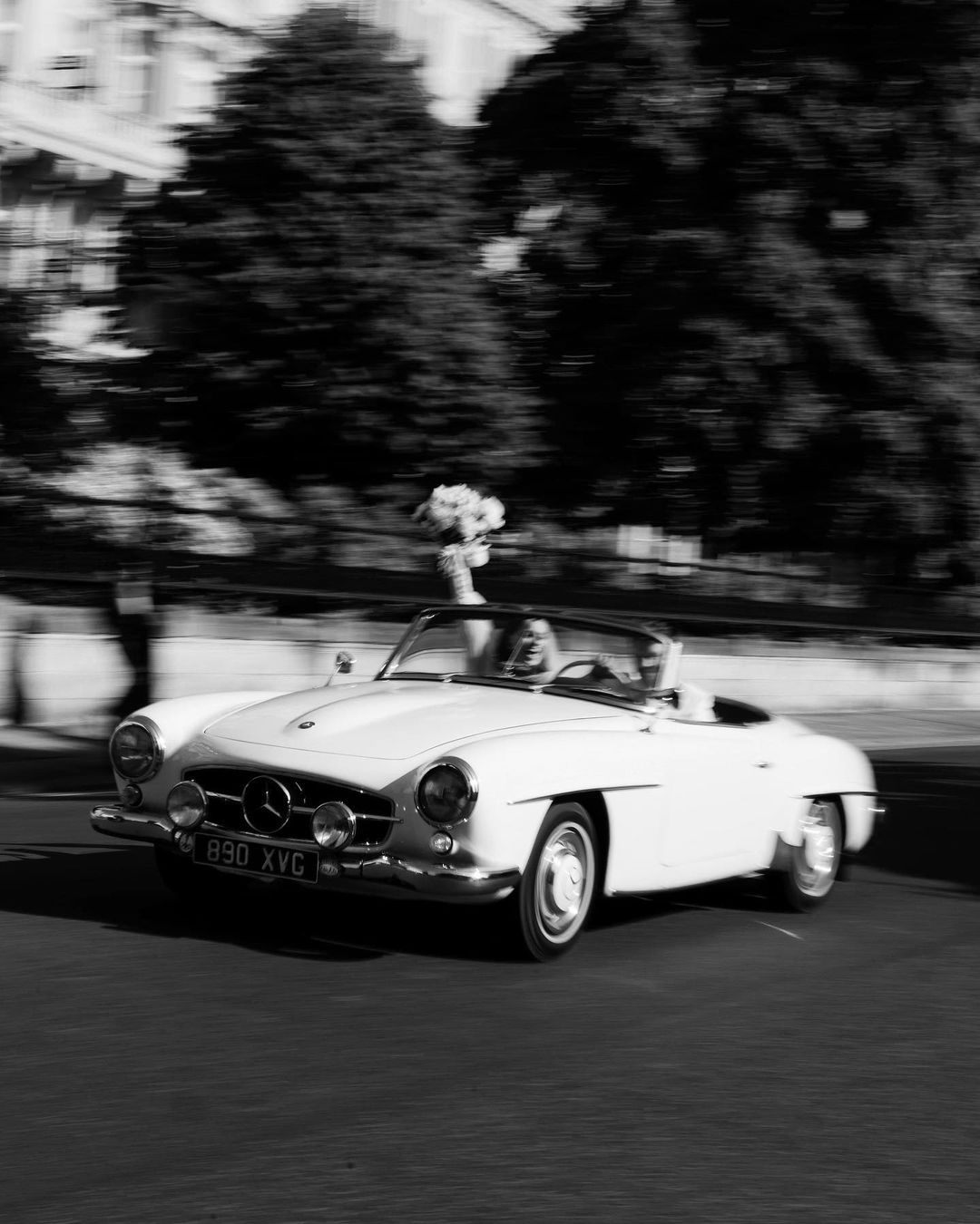 B & R cruising through the city in this gorgeous Mercedes SL.